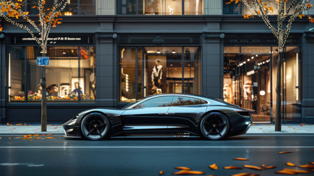 Sleek Black Sports Car Parked on Urban Street at Dusk with Illuminated Shops