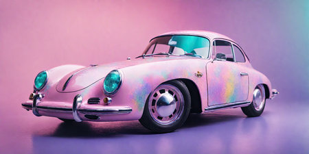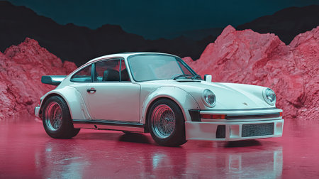 A white sports car is the main subject, set against a backdrop of stylized pink mountains. The composition features a low-angle shot, highlighting the vehicle's design. The lighting suggests a studio environment with vibrant color contrast, offering a futuristic aesthetic, suitable for various promotional and creative applications.