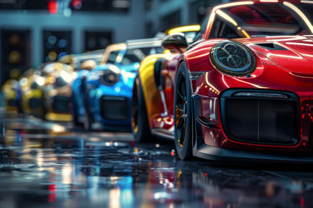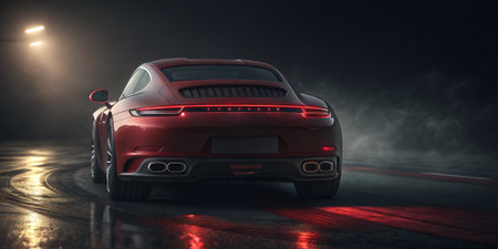 cinematic rear view of a red sports car with glowing taillights on a wet road at night showcasing sleek design and moody lighting for automotive photography lovers