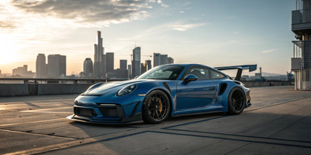 a sleek blue performance coupe parked on a rooftop with a dramatic city skyline at sunset showcasing aerodynamic design widebody stance and urban contrast