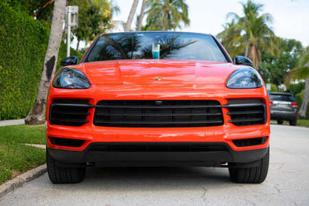 Palm Beach, Florida USA - March 21, 2021: orange Porsche Cayenne Coupe. front view.