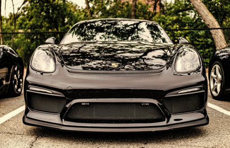Chicago, Illinois - September 29, 2024: 2016 Porsche Cayman GT4 black color. 2016 Porsche Cayman GT4 parked on the street. front view. 2016 Porsche Cayman GT4 in Chicago