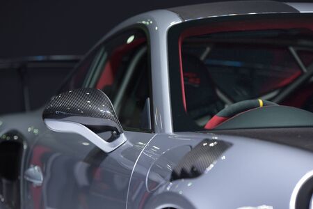 Zoom at sports car mirror and fender in Car show event with light bokeh at Bangkok, Thailand.