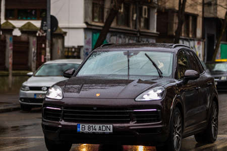 Cars in traffic at rush hour in downtown area of the city. Car pollution, traffic jam in the morning and evening in the capital city of Bucharest, Romania, 2021