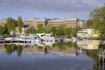 Stockholm. The scenic lagoon in a residential area. Blue sky and calm water