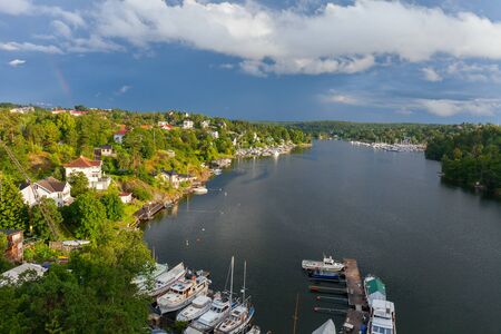 Yachts and houses reflected on calming water. Lifestyle in Norway