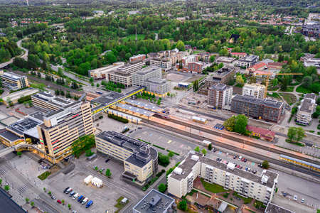 Espoo, Finland: May 29, 2020: Aerial view of Espoo central railway station.
