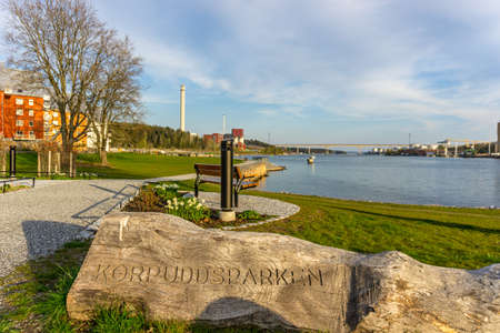 Sodertalje, Sweden - May 11, 2021: A park at the seaside with a pathway on sunny evening in spring