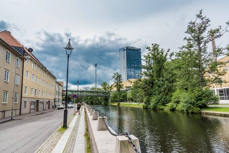 Downtown Umea, Sweden and its river with a cloudy sky.