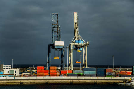 A bustling industrial port scene featuring large orange cranes and stacked shipping containers under a dramatic cloudy sky, highlighting maritime logistics.