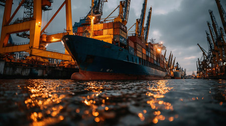 Container ship unloading cargo at Rotterdam illuminated quayside at dusk generated by artificial intelligence