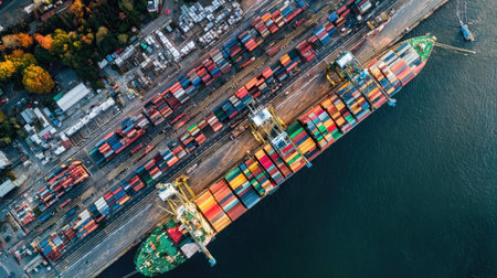 Aerial view of a busy shipping port with a large container ship docked. Colorful containers fill the docks, highlighting the bustling logistics and trade activity against a vibrant city skyline.