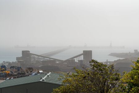 An Australian export coal loading terminal on a hazy day polluted by intense bush fire smoke