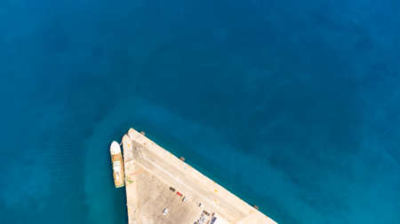 Aerial drone view of fishing boats moored at the harbor. moored at breakwater.