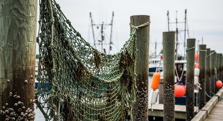 Green fishing nets draped over wooden posts at a harbor with boats and buoys in the background.