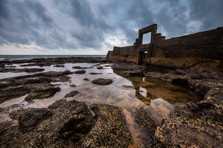 Beautiful landscape of abandoned house on rocky seashore at sunset time. Cloudy weather. Caspian Sea, Azerbaijan, Novkhani