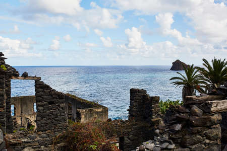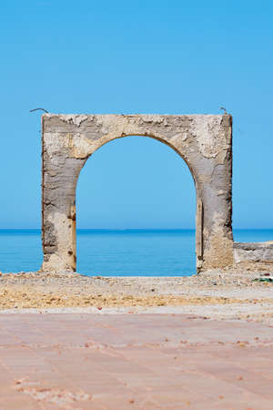 An old arch on ruins of an damaged house against blue sky and horizon over Sea. Copy space.
