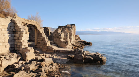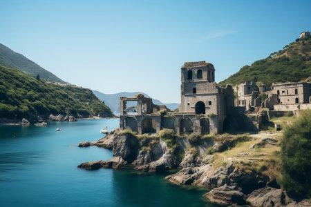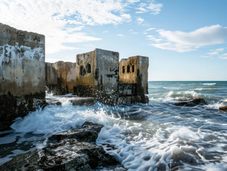 An enthralling seascape of ancient ruins perched on a rugged seaside cliff Majestic coastal ruins stand defiant against the relentless crashing waves, their eroded facades a testament to time and nature's forces The sky above is a canvas of moody hues, mirroring the drama of the ocean's symphony The vibrant colors capture the essence of this breathtaking scene, showcasing the raw beauty of the coastline and the enduring presence of the past AI Generative