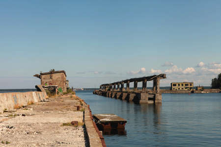 Hara/Estonia - June 9, 2019: Abandoned Soviet submarine repair base at Hara Harbour, North Coast of Estonia, the Baltic Sea at summer time.