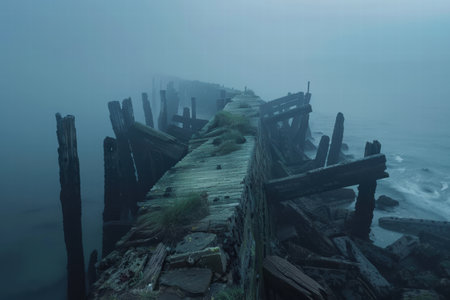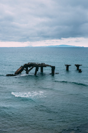 A vertical shot of an abandoned old pier in the sea on a gloomy day