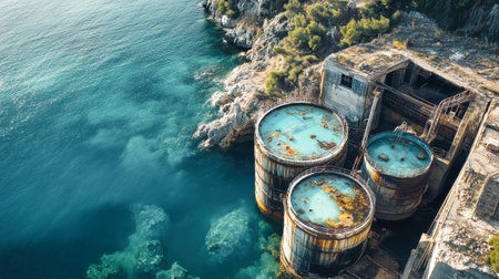An image showcasing an abandoned industrial building with a tall chimney beside a beautiful coastline. The serene water and desert terrain highlight the contrast between nature and decay.