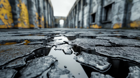 Cracked pavement with puddles reflects a desolate, abandoned urban environment, AI