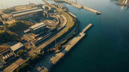An aerial shot captures a harbor with industrial buildings, piers, and roads. The scene is bathed in warm, golden light, highlighting the textures of the structures and the deep blue water.