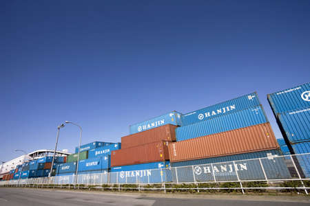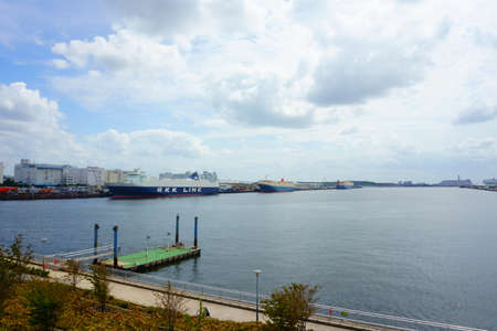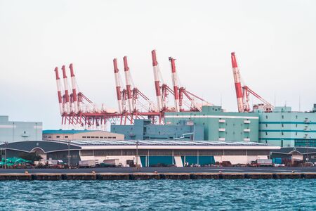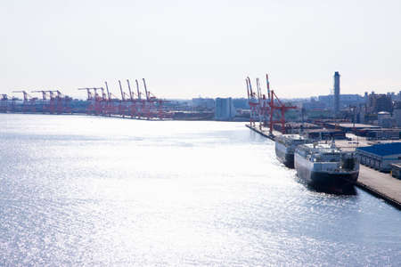 Yokohama Industrial Port with transportation ship aand a lot of warehouse crane