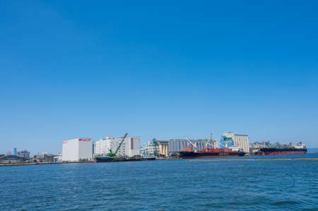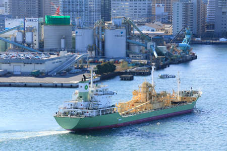 Cargo Hold Japan Coastal Ship is moored at Industrial port surrounded by factory buildings on Osaka Bay,Japan.
