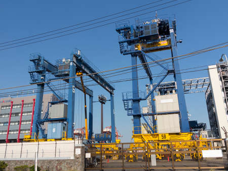 A dusk of Containers and cranes near the port in Aomi Tokyo telephoto shot