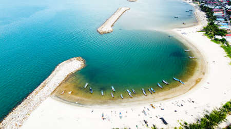 Aerial photo of breakwater the beach with view of group of people and small fishing boat on white sand beach, trees and clear sea water.