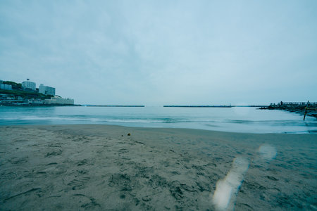 Empty sandy coast at Mediterranean sea in winter after storm in Alanya, Turkey