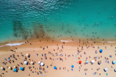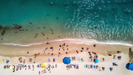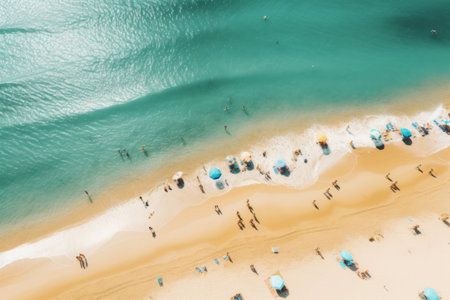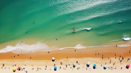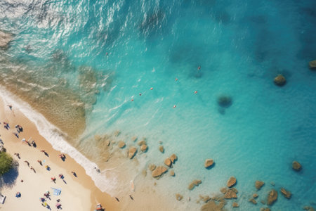 Aerial view of beautiful beach and sea, summer vacation concept, Aerial view of a sandy beach with tourists swimming in beautiful clear seawater, AI Generated