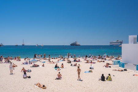 Vibrant Beach Scene with Yachts and Modern Structure in Cannes, France