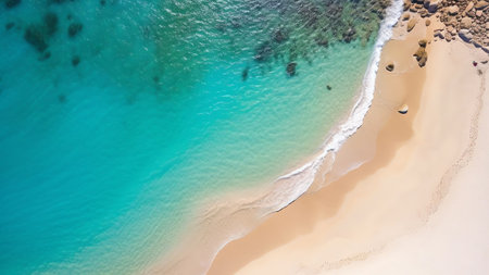 An aerial view of a coastal beach with rocks, surrounded by electric blue water. Natural landscape with oceanic and fluvial landforms, including reefs and lakes AIG50