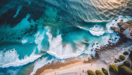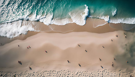 An aerial view of a sandy beach with people walking on it. The ocean waves are crashing on the shore, creating white foam and turquoise water.