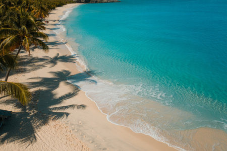 Turquoise waters caress the soft, sandy shore as shadows from palm trees dance in the sunlight, creating a serene tropical retreat.
