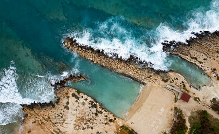 Aerial view of waves crashing against a rocky coastline, forming a tranquil natural pool with turquoise water in the mediterranean sea