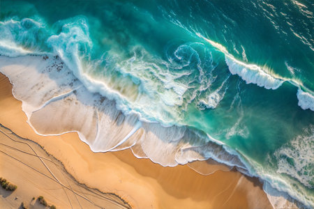 This image captures an aerial perspective of dynamic ocean waves crashing onto a pristine sandy beach, showcasing clear, rhythmic patterns and vivid colors that evoke a sense of tranquility and natural beauty encapsulated within the seascape.