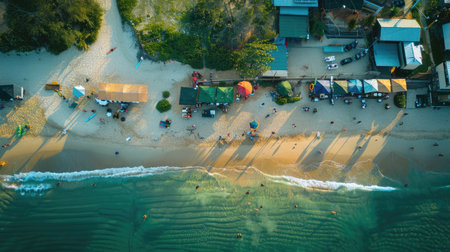 A birdseye view of a beach with colorful umbrellas and tents, surrounded by water and an urban design landscape. Perfect spot for leisure and recreation in the city AIG50