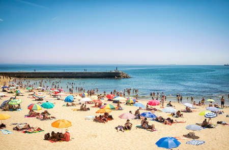 LISBON, PORTUGAL - JULY 26, 2016: Cascais beach near Lisbon in Portugal packed full of tourists and visitors
