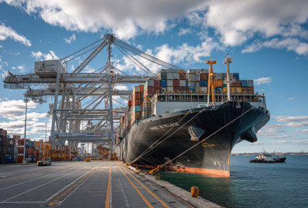 A large cargo ship is docked at a harbor, surrounded by containers and industrial cranes. The scene showcases a composition of structures and vessels under an overcast sky, with the city skyline visible in the distance. The image might be suitable for illustrating topics related to shipping, logistics, or global trade.