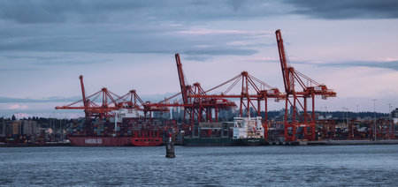 Downtown Vancouver, British Columbia, Canada - May 7, 2022: Panoramic View of Port in a modern city during cloudy colorful sunset.