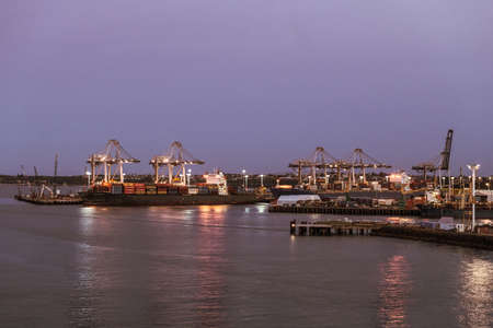 Auckland, New Zealand - March 6, 2017: Overview of the container terminal at sunset with ships. Lights on the docks reflected in the water.