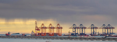 Port of Taichung, Taiwan. September, 24, 2020. Container terminal and vessels at the port while cargo operations and underway.
