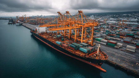 A dramatic aerial view showcasing a large container ship moored at a busy port, surrounded by cranes and numerous freight containers under a cloudy sky, highlighting the maritime industry.