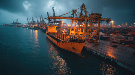 A dramatic nighttime view of a bustling port featuring a cargo ship docked with illuminated cranes, casting reflections in the water under a cloudy sky.