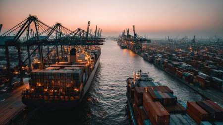 A stunning aerial perspective of a bustling container port at sunset, showcasing the intricate operations of shipping lanes filled with cranes, vessels, and cargo.