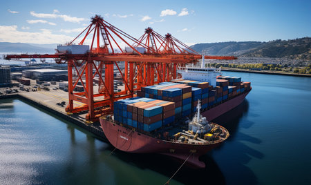 world of shipping transports. Depict a bustling port with cargo ships of various sizes and types, loading and unloading goods by cranes.Generated with AI