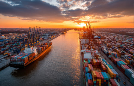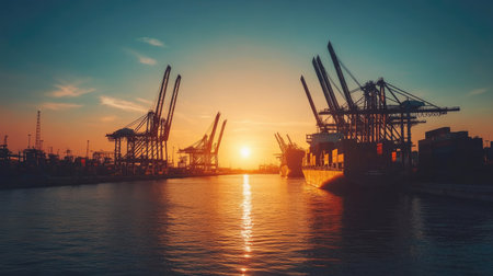 A panoramic view showcases container ships docked at a port, laden with shipping containers. The scene is illuminated by the warm hues of a sunset, highlighting the textures of the water and the structures. This image could be used for various commercial or editorial purposes related to logistics and global trade.